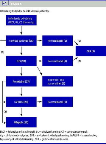 Udredningsforløbet for de inkluderede patienter fremgår af Figur 1 . Af de patienter, der ikke blev reseceret, havde en patient fået påvist levermetastasering ved abdominal ultralydsskanning (UL). Denne patient blev sat direkte til aflastende operation med en gastroenteroanastomose (GEA) uden forudgående endoskopisk ultralydsscanning (EUS). Ved EUS fandt man yderligere fire patienter med lokalavanceret sygdom og deraf følgende ikkeresektabilitet, hvoraf to patienter efterfølgende blev aflastet med en GEA. To patienter blev vurderet uegnede til kirurgi på grund af komorbiditet på trods af teknisk resektable cancere. Hos en patient fandt man metastaserende sygdom ved laparoskopi og laparoskopisk ultralydskanning. Patienter med resektable tumores fi k alle foretaget Whipples resektion.