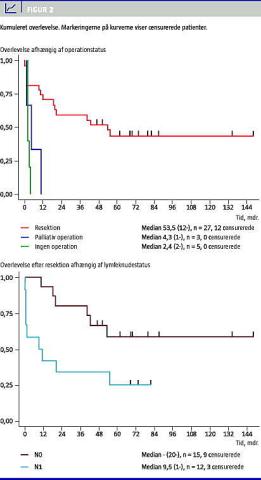 Der var en signifikant forskel (p = 0,025) i overlevelsen mellem patienter med spredning til lymfeknuder (N1, 12 patienter, mediant 9,5 måneder) og patienter uden spredning (N0, 15 patienter, median ikke nået endnu). Den estimerede femårsoverlevelse for disse to grupper var på henholdsvis 25% (6-50%) (N1) og 58% (29-79%) (N0).