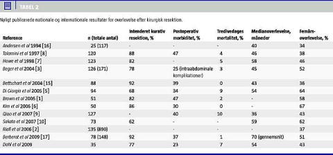 I Tabel 2 sammenlignes data fra dette studium med den foreliggende litteratur. De angivne arbejder er udvalgt som de nyeste og største, der beskriver isolerede og relevante data vedrørende papilcancere. Flere af de angivne studier beskæftiger sig ud over papilcancerne også med øvrige periampullære tumorer, men de angivne data er alle isolerede papilcancerdata (total n i parentes). Der er en betydelig spredning vedrørende den estimerede femårsoverlevelse (34-67%) [2, 6, 9, 10, 14], men overlevelsen i dette materiale ligger på niveau med den foreliggende litteratur. Generelt set synes femårsoverlevelse at indikere en øget chance for langtidsoverlevelse. Eksem-pelvis viser Riall et al i et studie fra 2006 en estimeret yderligere femårsoverlevelse på 66% for de patienter, der var i live fem år efter resektion [2].