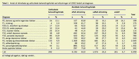 Af Tabel 1 fremgår det, at for hele materialet (samtlige behandlingsforløb) var de tre hyppigste diagnosegrupperinger F4, nervøse og stressrelaterede lidelser, F3, affektive lidelser, og F6, personlighedsforstyrrelser.