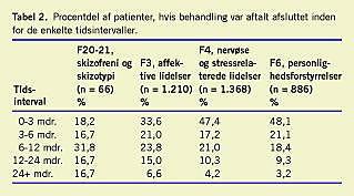 Behandlingsvarigheden for personer med disse tre diagnoser og med F2, skizofreni, der er medtaget, fordi denne gruppe patienter påkalder sig særlig opmærksomhed som følge af nedlæggelse af sengepladser i hospitalspsykiatrien, fremgår af Tabel 2 , der alene viser patienter med aftalt afslutning af behandlingsforløb.