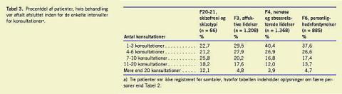 Mere end 50% af behandlingsforløbene i de tre største diagnosegrupper blev afsluttet inden for seks konsultationer, 57,4%, 67,3% og 64,2% for affektive tilstande, nervøse lidelser og personlighedsforstyrrelser respektive. Mindre end 5% af behandlingsforløbene i disse diagnosegrupper var på mere end 20 konsultationer. I gruppen af patienter med skizofreni er der en tendens til flere konsultationer, 12,1% fik 21 eller flere konsultationer, 43,9% fik seks eller færre. 37,7% af mændene og 34,7% af kvinderne fik behandlingen afsluttet efter 1-3 konsultationer (nonsignifikant (ns)), og 44,2% af mændene og 41,5% af kvinderne fik behandlingen afsluttet i løbet af de første tre måneder (ns) (ikke vist i tabellen).