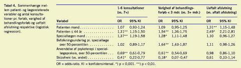 Tabel 4 viser i en logistisk regression sammenhænge mellem patient- og lægevariabler og antal konsultationer pr. forløb (1-6 vs. 7+) og varighed af behandlingsforløb (< 3 måneder vs. 3+ måneder). I disse analyser indgår det første behandlingsforløb for alle patienter med aftalt afsluttet behandlingsforløb (n = 4.193). Første behandlingsforløb er inkluderet for alle med aftalt afsluttet forløb samt forløb afsluttet ved død, indlæggelse på sygehus eller »andet« i en logistisk regressionsanalyse af uaftalt behandlingsafslutning (n = 1.573) vs. aftalt behandlingsafslutning (n = 4.494).