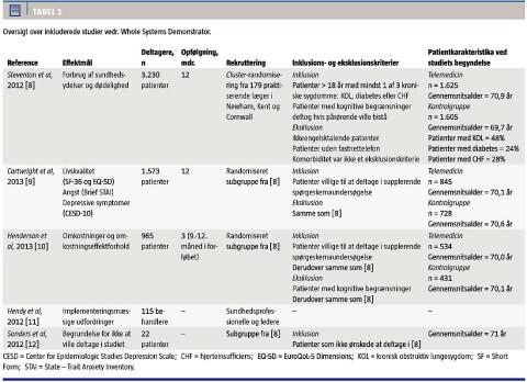er få randomiserede studier af telemedicin. Et tredje [3] viser, at studier af telemedicin generelt ikke følger anerkendte standarder. I et dansk review vedr. patienter med kronisk obstruktiv lungesygdom (KOL) [4] påpeges behovet for større telemedicinstudier af bedre kvalitet.