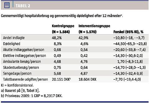 Forbruget af hospitalsydelser var generelt lavere i interventionsgruppen end i kontrolgruppen (Tabel 2). Andelen af patienter, som blev indlagt, var således 10,8% lavere (statistisk signifikant) i interventions-gruppen, svarende til en oddsratio på 0,82. Forskellen lå primært inden for de første tre måneder efter inklusion i studiet. Justering for forskel i baseline-data og patienternes forbrug tre år før inklusion ændrede ikke herved. Dødeligheden var 8,3% i kontrolgruppen og 4,6% i interventionsgruppen (statistisk signifikant), hvilket svarer til en oddsratio på 0,54.