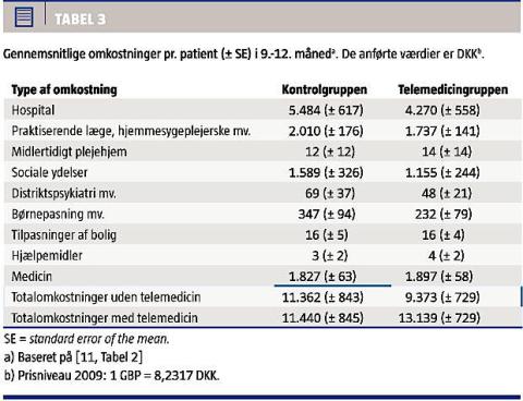 Tabel 3 viser, at omkostningerne i telemedicin-gruppen var 15% højere end i kontrolgruppen. År-sagen hertil er, at de telemedicinske ydelser i gennemsnit koster 15.204 kr. pr. patient pr. år og dermed mere end opvejer gevinsten ved et lavere forbrug af sundhedsydelser. Ingen af resultaterne er statistisk signifikante.