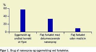 Et nyere fælles projekt omhandlede civile piloters brug af detumescerende næsespray og sygemelding ved forkølelse, idet dette kan føre til barotraume i ører og bihuler med en deraf følgende flyvesikkerhedsmæssig risiko. Den retrospektive undersøgelse med deltagelse af 1.000 piloter viste, at kun lidt under halvdelen meldte sig syge over for arbejdsgiver og, som de burde, undlod at flyve (Figur 1 ). Cirka halvdelen havde oplevet øre- eller bihulebarotraume på et eller andet tidspunkt i deres karriere. Dette må bekymre [1]. Fremtiden udfordrer flyvemedicinen, da der er nye regler for civile professionelle piloters daglige arbejdslængde. En arbejdsuge vil nu kunne komme op på 60 (mod de hidtidige 45 timer) i op til tre uger i træk. Dette med fare for fatigue og dermed flyvesikkerheden. Dette bekymrer [2].
