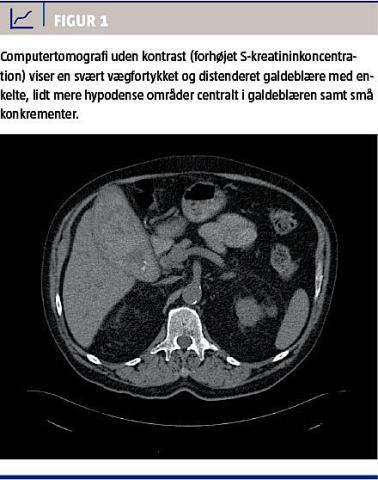 Hans hæmoglobinniveau var faldet fra 5,8 mmol/l til 3,6 mmol/l på tre uger. Alanintransaminaseniveauet var 169 U/l (referenceinterval 10-70 U/l), basisk fosfatase-niveauet var 854 U/l (referenceinterval 35-105 U/l). Bilirubinniveauet og koagulationsfaktorerne 2, 7, 10 var normale. Ved en abdominal ultralyd (UL)-skanning og computertomografi (CT) sås en uregelmæssig, tykvægget galdeblære, som indeholdt en hypodens masse og små konkrementer (Figur 1). En gastroskopi og en koloskopi viste normale forhold uden tegn til gastrointestinal blødning. Patienten blev henvist til operation på mistanke om galdeblærecancer.