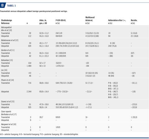 Ved litteraturgennemgang frem til september 2018 er der fundet syv retrospektive studier og to kasuistikker, hvor man sammenligner karakteristika for traumatisk BPPV og idiopatisk BPPV [10-18] (Tabel 1). Ved traumatisk BPPV er patienterne generelt yngre end ved idiopatisk BPPV [10-15]. Den posteriore buegang findes at være den hyppigst involverede buegang i både traumatisk og idiopatisk BPPV. Der er ikke evidens for, at den horisontale og den anteriore buegang er hyppigere involveret hos patienter med traumatisk BPPV end hos patienter med idiopatisk BPPV [10-15].