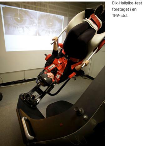 til behandling af BPPV, hhv. Epley Omniax Rotator (Vesticon) og TRV-stolen (Interacoustics) [5, 6]. Med disse stole er det muligt at rotere patienten 360 grader i to dimensioner samtidig med, at reaktiv nystagmus registreres vha. videonystagmografi, som er en optagelse med et øjenkamera, som desuden forhindrer fiksering af synet. Disse kvaliteter giver stolene en diagnostisk styrke, idet man nøjagtigt kan identificere den eller de afficerede buegange, der er involveret, og følge effekten af behandlinger [7-9]. Repositionsstolens rolle i diagnostik og behandling af patienter, der har BPPV og har