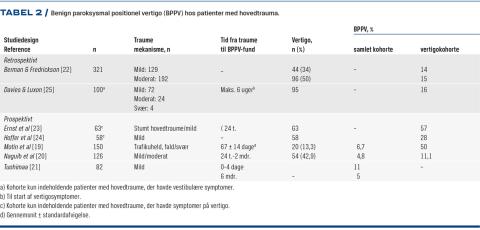 Frem til september 2018 er der udgivet fem prospektive studier og to retrospektive studier, der omhandler BPPV som komplikation i forbindelse med hovedtraume [19-25] (Tabel 2). Incidensen af BPPV blandt patienter med hovedtraumer er i tre af studierne med en samlet kohorte på 358 patienter opgivet til 4,8-6,7% [19-21]. I seks studier er BPPV-incidensen opgjort hos patienter, der klagede over svimmelhed efter hovedtraumer. I en samlet kohorte på 335 patienter er der opgivet en incidens på 11-57% [19, 20, 22-25]. Der