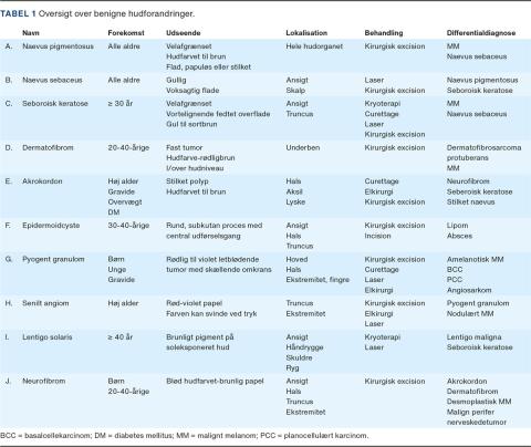 En væsentlig del af henvendelserne drejer sig om benigne hudforandringer i såvel almen praksis som på dermatologiske og plastikkirurgiske afdelinger. En dermatolog må forvente at se 20-40 benigne hudforandringer for hvert malignt melanom [1]. De fleste benigne hudforandringer diagnosticeres ofte ud fra sygehistorien og de kliniske fund. Dermatoskopet kan være et nyttigt værktøj til at støtte en klinisk formodning, men det kræver dog en vis træning at bruge for at øge den diagnostiske præcision [2, 3]. Formålet med denne artikel er at skabe et overblik over almindeligt forekommende benigne hudforandringer samt deres klassiske karakteristika, der kan bruges differentialdiagnostisk over for mere alvorlige hudforandringer (Tabel 1).