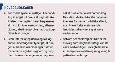 Benzodiazepines (BZ) are used for anxiety across psychiatric diagnoses but recently regulation has been more tight due to tolerance problems, addiction, withdrawal symptoms and cognitive side effects. Some guidelines claim that BZ only work for few weeks, and that BZ cause traffic accidents, increased mortality and dementia. In Denmark, the use of BZ has been substantially reduced. In this article, it is argued that: not all patients habituate, most of the epidemiological findings are hampered by confounding, and there still is a role for long-term BZ in anxiety treatment.