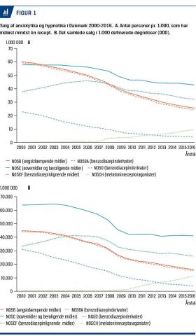 lægemidler i 1960 i Danmark. Indikationerne er som dengang søvnbesvær, akut situationsbetinget angst og som akut behandling eller tillægsbehandling ved angsttilstande, psykoser, depression og mani [1]. Desuden bruges BZ ved alkoholabstinenstilstande, feberkramper og epilepsi og som præmedicin ved kirurgiske procedurer, som denne statusartikel ikke omhandler. I løbet af få år afløste BZ de tidligere anvendte mere toksiske stoffer som barbiturater, chloralhydrat og mebrobamat, men der udviklede sig hurtigt konsensus om, at der manglede dokumentation for effekten af længevarende behandling med BZ [1, 2]. Som ved de ældre anxiolytika sås desuden toleransudvikling, psykisk eller fysisk afhængighed samt abstinenssymptomer ved ophør og misbrug. Dette har medført en mangeårig international bekymring over det, der opfattedes som et relativt stort forbrug i befolkningen [1, 3]. Specielt efter fremkomsten af selektive serotoningenoptagelseshæmmere (SSRI) og serotonin- og noradrenalingenoptagelseshæmmere til behandling af angstlidelser har myndighederne gennemført en række tiltag med det formål at begrænse forbruget. Dette er bl.a. sket ved stramning af de officielle retningslinjer, hvori det understreges, at BZ kun bør bruges kortvarigt – dvs. 2-4 uger – samt ved at begrænse retten til at føre motorkøretøj for patienter, som er i BZ-behandling [1]. Dette er, som det fremgår af Figur 1 og [4], associeret til et betydeligt fald i forbruget. På den baggrund vil vi i denne artikel resumere og perspektivere den nuværende viden om BZ’s gavnlige og skadelige virkninger.