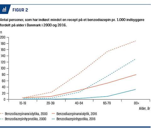 I 2016 var der i Danmark hhv.136.450 (2,4%) og 24.063 (0,4%) voksne, som indløste mindst én recept på et BZ-præparat ordineret enten som anxiolytikum eller hypnotikum (www.medstat.dk). Ifølge en analyse fra 2012 er kun en mindre del af disse receptindløsere i daglig behandling [4]. Andelen af voksne, som får ordineret BZ, stiger med alderen (Figur 2), men andelen er faldet i de seneste årtier i alle aldersgrupper (Figur 1 og Figur 2) i både primær- og sekundærsektoren og for samtlige præparattyper. Det er især ordinationer af de langtidsvirkende stoffer, f.eks. diazepam, som er reduceret, ligesom der bliver færre, som har et stort eller langvarigt forbrug [4]. BZ udgør fortsat hovedparten (95%) af samtlige solgte mængder (definerede døgndoser) anxiolytika, men under 10% af hypnotikasalget, hvor BZ-lignende stoffer (f.eks. zolpidem) og melatoninagonister nu er mere dominerende (hhv. 66% og 10% mod tidligere 50% og 0%) (Figur 1). Andelen af indbyggere (Figur 1A og Figur 2), som får ordineret BZ er lavere i Danmark end i andre vesteuropæiske lande [5-7], USA [8] og Canada [9]. I disse lande ligger prævalensen af BZ-brug på mellem 5% i USA [8] og 9% i Schweiz [6], og forbruget er ikke reduceret i samme omfang som i Danmark.