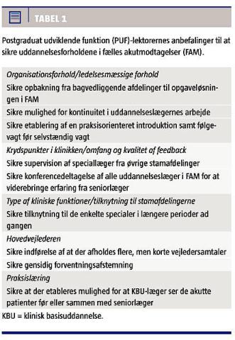 Af rapporterne fremgår det, at det er positivt, hvis man i skemalægningen tager hensyn til den enkelte læges kompetenceniveau, og hvis der er et tilstrækkeligt antal læger med vejlederkompetence samt et tilstrækkeligt antal speciallæger, der har tilknytning til FAM og kan supervisere uddannelseslægerne. Introduktionen af lægerne bør være praktisk orienteret. Endvidere er det positivt at få en uddannelsesplan, hvor arbejdsopgaver og feedback på kliniske opgaver planlægges. Derimod beskrives det som uhensigtsmæssigt, hvis der kun gives kort introduktion til vagtarbejdet.