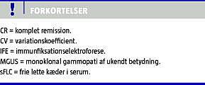 sFLC bør tages hos myelomatosepatienter, der er i komplet remission (CR) efter kemoterapeutisk behandling til bestemmelse af stringent CR. CR bestemmes ud fra normalisering af knoglemarv og M-komponent [9]. Resultaterne fra flere undersøgelser tyder på, at en vedvarende abnorm κ/λ-ratio på tidspunktet for CR er et advers prognostikum, der formentlig kan tages som udtryk for minimal restsygdom.
