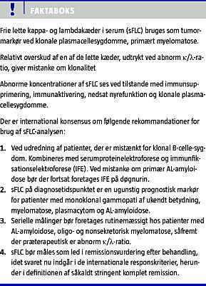 FLC-analysen udgør potentielt et stort fremskridt i diagnostik, behandling og kontrol af patienter med myelomatose og andre klonale plasmacellesygdomme, specielt når det drejer sig om nonsekretorisk/oligosekretorisk myelomatose og primær AL-amyloidose.