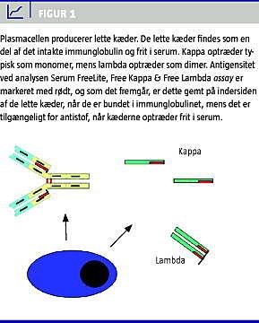 Immunglobulin er symmetrisk opbygget af to tunge kæder og to lette kæder. De tunge kæder navngiver immunglobulinklassen. I blodet udgøres størstedelen af immunglobulin (Ig) af type IgA, IgG og IgM. Hvert immunglobulin udtrykker herudover en let kæde, enten κ eller λ. De lette kæder dannes i plasmacellerne, ca. 500 mg/døgn. For at sikre dannelsen af intakt immunglobulin er der en let overproduktion af lette kæder, hvilket resulterer i en intracellulær pool af frie lette kæder, se Figur 1 . De lette kæder er små molekyler med en molekylvægt på ca. 22.000 g/mol. κ findes typisk som monomer, λ som dimer. Der forekommer højere polymere former af begge kæder [10].