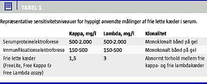 Bestemmelse af FLC i blodet er første gang rapporteret i 1965 af Tan & Ebstein [3]. Metoden til bestemmelse af FLC er siden udviklet i takt med bedre analytiske teknikker. I 2001 kom det første kommercielle assay (The Binding Site Ltd., Storbritan-nien) til måling af frie lette kæder i serum (sFLC) på markedet [4]. Anvendelsen af analysen er stigende i takt med en øget dokumentation for analysens nytteværdi. Serum-FLC-analysen supplerer de nuværende diagnostiske redskaber ved monoklonale sygdomme, men analysen kan ikke erstatte urinelektroforesen, der sammen med serum proteinelektroforesen fortsat er de centrale elementer i diagnostisk og responsvurdering ved de monoklonale plasmacellesygdomme. Analysens rolle i forbindelse med diagnostik og monitorering af plasmacellesygdomme er under pågående evaluering. Der er flere uafklarede aspekter ved brug af analysen, herunder præanalytiske, analytiske og postanalytiske forhold, hvilket har været medvirkende til en vis skepsis og tilbageholdenhed med at indføre analysen. Med baggrund i den foreliggende dokumentation anno 2009 har International Myeloma Working Group [5] følgende fire nøglerekommandationer for brugen af sFLC: