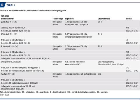 I et skotsk studie af Short et al [23] med 6.000 patienter, der havde KOL og blev fulgt i almen praksis og i lungeambulatorier, var kun 14% i betablokkerbehandling. I dette studie havde patienter, som var i betablokkerbehandling, en signifikant bedre overlevelse og færre indlæggelseskrævende eksacerbationer end dem, som ikke fik betablokkere. I to øvrige studier har man også set på sammenhængen mellem betablokkerbrug og akutte eksacerbationer af KOL, hvor man i et studie fandt 30% og et andet 40% reduceret risiko for eksacerbation [24, 25]. Begge studier viste signifikant reduceret mortalitet ved betablokkerbehandling.