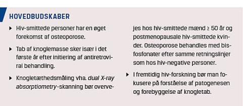 I flere studier har man fundet højere forekomst af osteopeni/osteoporose og frakturer blandt hiv-smittede personer end i baggrundsbefolkningen [2, 3]. Formålet med denne statusartikel er at beskrive den eksisterende viden på området, udrednings- og behandlingsstrategier, diskutere, inden for hvilke områder der mangler viden, samt anvise perspektiver for fremtidig forsk-ning.
