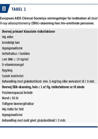 I 2015 publicerede 34 hiv-specialister fra 16 lande anbefalinger til udredning og behandling af osteoporose hos hiv-smittede personer [28]. De anbefaler, at BMD vurderes ved DXA-skanning hos alle hiv-smittede personer, som har høj risiko for lavenergifraktur (inklusive tidligere lavenergifrakturer, behandling med systemisk glukokortikoid > 3 måneder eller høj risiko for fald) [28]. Desuden anbefaler de, at mænd ≥ 50 år og postmenopausale kvinder får BMD vurderet ved en DXA-skanning [28]. Hvis der konstateres osteoporose, bør bisfosfonatbehandling initieres i henhold til de gængse retningslinjer. I øvrige tilfælde anbefales en ny DXA-skanning inden for 1-5 år, afhængigt af T-score [28]. The European AIDS Clinical Societys retningslinjer er på linje med disse anbefalinger (Tabel 1) [27], dog med mindre faste vejledninger hos mænd i 50-års alderen og postmenopausale kvinder. Endvidere anbefales det, at man er meget opmærksom på de klassiske risikofaktorer. Andre indikationer for osteoporosescreening hos hiv-smittede personer bør følge retningslinjerne for den almindelige befolkning [2].