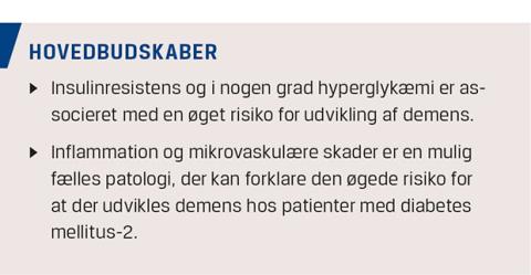 Type 2-diabetes (DM2) er associeret med en tilnærmelsesvis fordoblet risiko for at udvikle demens og en række kognitive forandringer [1-3]. Den eksakte patologiske baggrund for denne association er endnu ikke klarlagt. Cerebral insulinresistens, forekomst af hyper- og hypoglykæmi samt mikrovaskulære forandringer har sammen med al senere progression af neuroinflammation betydning for udviklingen af kognitive forstyrrelser, herunder vaskulær demens og Alzheimers sygdom (AD). DM2 har således en accelererende eller kausal betydning for udviklingen af demens.
