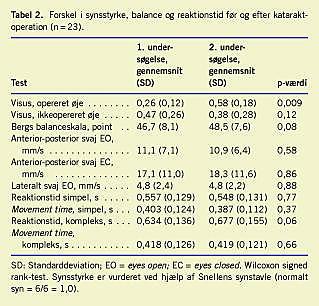 Resultater: Hos de yngste i gruppen med dårligst balance kunne der dokumenteres en bedring af balancen efter kataraktoperationen. Blandt dem, der var mest afhængige af synet i deres balancekontrol, sås også en bedring. Der var ingen indlæringseffekt af de valgte test.