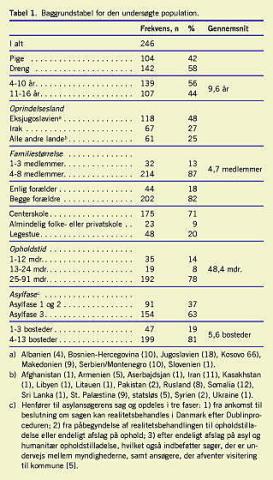 Baggrundskarakteristika for de 246 børn fremgår af Tabel 1. I alt havde 86% været asylansøgende i 13 måneder eller mere, og den gennemsnitlige opholdstid var fire år. Børnene havde gennemsnitligt boet på knapt seks asylcentre i Danmark.