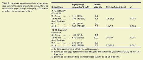 Antallet af flytninger var også forbundet med psykiske vanskeligheder i det samlede materiale, eftersom vi fandt, at de børn, der havde boet fire eller flere steder, havde forøget risiko for at have psykiske problemer i forhold til de øvrige. En kombination af lærer- og børnebesvarelser viste ligeledes en markant forøget risiko for psykiske problemer blandt 11-16-årige børn, der har boet fire eller flere steder. I disse regressionsanalyser fremstod derudover kun køn som signifikant faktor.