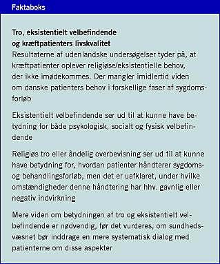 Der har i de seneste år været stigende interesse for betydningen af religiøse og eksistentielle faktorer for kræftpatienters livskvalitet, sygdomsforløb og - måske - overlevelse. Religiøsitet og/eller spiritualitet henviser her til patienters søgen efter betydning eller mening på måder relateret til »det hellige« (the sacred ) i bred forstand. Mens religiøsitet i traditionel forstand forstås som et struktureret trossystem, der er forbundet med specifikke ritualer eller praksisformer, kan den eksistentielle dimension overordnet defineres som »behov for at finde mening, fred og formål med sin væren i livet« [1]. Eksistentielt velbefindende (spiritual well-being ) kan således defineres som et universelt fænomen, der antages at kunne forekomme både i og uden for traditionelle trossystemer.