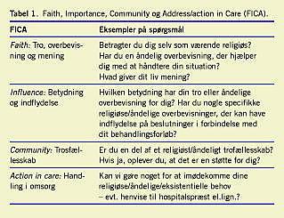 Det må betragtes som uafklaret, i hvor stor udstrækning danske patienter oplever religiøse/eksistentielle behov, og hvorvidt sådanne ønskes imødekommet. Samtidig kan en sundhedsfaglig samtale om eksistentielle behov tænkes at blive oplevet som særlig udfordrende i et sekulært samfund som det danske, hvor religiøs eller åndelig overbevisning generelt betragtes som et privat anliggende. Der foreligger en række redskaber, der er udviklet til udforskning af patientens religiøse/åndelige baggrund og kan anvendes i sammenhæng med vurdering af andre forhold, f.eks. familiær/social baggrund [10]. Faith, Importance, Community og Address/action in Care (FICA), som er beskrevet i Tabel 1 , er et af de hyppigst anvendte i USA. Der er imidlertid brug for undersøgelser af, om der er brug for sådanne kommunikationsredskaber i dansk klinisk praksis, og i bekræftende fald om de fungerer tilfredsstillende eller skal tilpasses danske forhold.