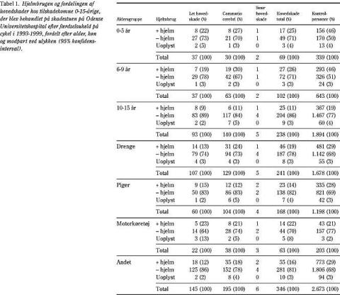 Fordelingen med hensyn til alder, køn, modpart og brug af hjelm ved uheldet ses i Tabel 1 . Hjelmbrugen var 17% (69/409) hos tilskadekomne med hovedskader og 28% (816/ 2.876) hos kontrolgruppen. Det ses, at der ved kollision med motorkøretøjer ikke er forskel på at have hjelm på eller ej.