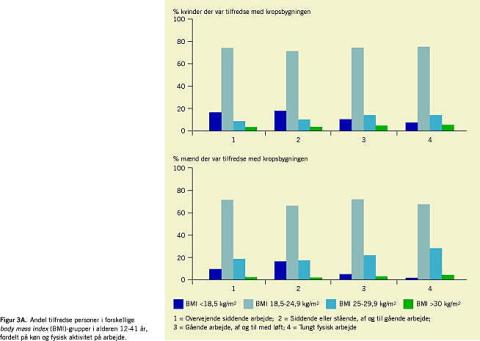 Blandt mændene var 81% tilfredse med deres kropsbygning, mens det samme gjaldt for 65% af kvinderne, χ22d.f· = 114,73, p < 0,0001. Der var dobbelt så mange mænd (20,3%) som kvinder (10,3%) med et BMI > 24,9 vurderet på baggrund af deres besvarelse af spørgeskemaet.