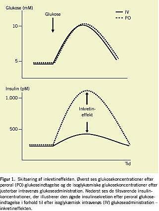 Indtagelse af kulhydrater medfører frigørelse af substanser fra tarmen (inkretinhormoner), som øger insulinsekretionen til koncentrationer, som er større end koncentrationer baseret på glukoseabsorptionen alene. Dette fænomen kaldes inkretineffekten. Størrelsen af inkretineffekten kan kvantificeres ved sammenligning af insulinresponser efter oral og intravenøs glukoseadministration, givet i en sådan mængde at identiske glukosekoncentrationer opnås som illustreret i Figur 1 [1, 2]. Inkretineffekten hos raske personer er årsag til op til 70% af insulinresponset efter oral glukose [3], og det er derfor oplagt, at en defekt inkretinfunktion må forventes at medføre markant postprandial hyperglykæmi. Det er påvist, at patienter med type 2-diabetes mellitus har en markant reduceret eller måske helt manglende inkretineffekt [4]. Dette fund har øget opmærksomheden på en eventuel betydning af inkretinhormonerne GIP og GLP-1 for patogenesen ved type 2-diabetes mellitus, idet bortfald af inkretineffekten kan tænkes, at bidrage væsentligt til den relative insulinmangel hos disse patienter.