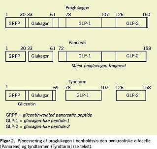 I 1983 blev genet, som koder for proglukagon, forstadiet til det pankreatiske hormon glukagon, identificeret, og det blev vist, at genet ikke alene udtrykkes i alfacellerne men tillige i endokrine L-celler i tarmen. I pancreas spaltes proglukagon til glukagon, glicentin-related pancreatic peptide (GRPP) og major proglucagon -fragment, hvoraf glukagon formentlig er det eneste biologisk aktive peptid. I modsætning hertil resulterer den posttranslationelle processering af proglukagon i tarmens L-celler i dannelsen af GLP-1, glucagon-like peptide-2 (GLP-2), som har en central rolle i reguleringen af tyndtarmens vækst, og glicentin (Figur 2 ) [11]. GLP-1 er en af de mest insulinotrope substanser, som kendes, og i studier er det påvist, at GLP-1 er årsag til en anseelig del af insulinresponset efter oral glukoseindtagelse.
