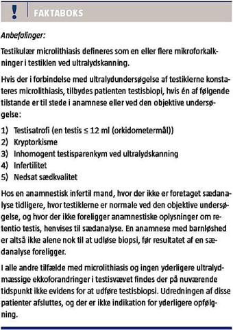 Anderledes ser det ud hos mænd med andre risikofaktorer for testiscancer. I et nyligt publiceret studie beskrives patienter med TM, som blev diagnosticeret under udredning af skrotal patologi og/eller infertilitet. Her inkluderede man 51 mænd med klassisk TM og en gennemsnitlig followuptid på 33,3 måneder. Samtidig foretog forfatterne en litteraturgennemgang, hvor de inkluderede microlithiasisstudier med mere end 15 deltagere og en medianfollowuptid på mindst to år. Den samlede analyse (n = 389) viste, at kun fire mænd fik cancer, og at tre ud af disse havde yderligere risikofaktorer i form af hhv. tidligere testiscancer og testisatrofi [27]. Andre forfattere har undersøgt patienter med TM i sammenhæng med kryptorkisme, og fundet, at 10% af disse fik testiscancer ved en medianfollowuptid på otte år [28].
