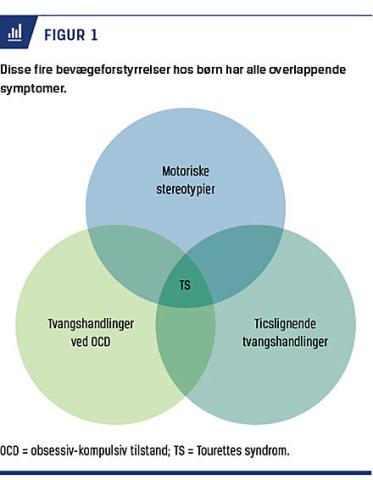 Bevægelsesforstyrrelser, som debuterer i barndomsalderen, er en kompleks og heterogen gruppe af tilstande, som kan være svære at skelne fra hinanden. Forstyrrelserne har mange ligheder og overlappende symptomer. Derudover kan de være til stede samtidigt, hvilket besværliggør diagnosticeringen yderligere. Med henblik på korrekt diagnosticering og relevant henvisning til behandling er det dog vigtigt at kunne adskille tilstandene fra hinanden. I denne artikel sætter vi fokus på fire bevægelsesforstyrrelser, der ses hos børn og hyppigt forveksles med hinanden, men som kan adskilles ved fokusering på specifikke symptomer. Med udgangspunkt i Tourettes syndrom (TS) fokuserer vi i denne artikel på bevægelsestics, tvangshandlinger ved obsessiv-kompulsiv tilstand (OCD), ticslignende tvangshandlinger og stereotypier (Figur 1).