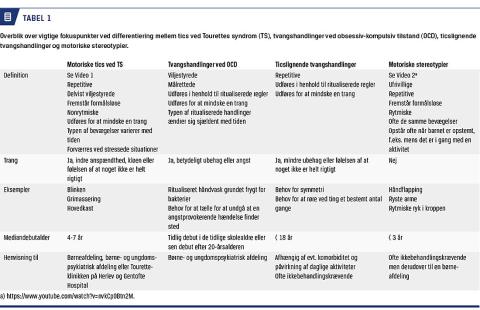 Bevægelsestics ved TS, tvangshandlinger ved OCD, ticslignende tvangshandlinger og motoriske stereotypier er alle bevægeforstyrrelser, der debuterer i barndommen og kan være vanskelige at adskille fra hinanden. Fokuserer man dog i anamnesen på bestemte kriterier og symptomer, kan man lettere diskriminere mellem tilstandene (Tabel 1). Man bør have in mente, at tilstandene ikke sjældent eksisterer samtidigt. Det er derfor vigtigt at kunne adskille dem, så barnet kan henvises til den rette behandling for den mest belastende tilstand. Et barn, der har symptomer på både TS og OCD og ikke kan fungere i skolen på grund af angst for at noget frygteligt vil ske, hvis det ikke udfører bestemte handlinger, skal henvises til behandling for sin OCD i første omgang. Omvendt skal barnet henvises til behandling for sine tics, hvis det største problem er, at antallet af tics giver koncentrationsproblemer i skolen.