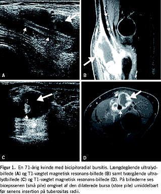 Vi har beskrevet en tilstand, der kun er rapporteret få tilfælde af i litteraturen [1-4]. Tilstanden er derfor næsten ukendt inden for MR- og UL-skanning. I fossa cubiti er der lokaliseret to bursae: den bicipitoradiale bursa og den interossøse bursa. En bursa består af en simpel synovialmembranbeklædt sæk støttet af bindevæv. Funktionen er at reducere friktionen mellem strukturer, der gnider mod hinanden, i dette tilfælde bicepssenen og de omkringliggende strukturer. Den hyppigste årsag til forstørrelse og inflammation af denne bursa (bursitis) er et mekanisk repetativt traume. Andre årsager inkluderer infektion, inflammatorisk ledsygdom og knogleproliferation.