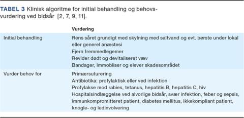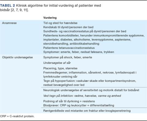Når man som kliniker står over for en patient med bidsår, bør man optage en detaljeret anamnese, hvor der spørges specifikt om bidsårets opståen, tid siden hændelsen, forhold til dyret/mennesket, der bed, og sundheds- og vaccinationsstatus på denne [7, 8]. Derudover er det vigtigt med kendskab til patientens sundheds- og vaccinationsstatus. Patienter med komorbiditeter såsom immunkompromitterende sygdomme, implantater (såsom hjerteklap og hoftealloplastik), diabetes, alkoholisme, leversygdomme og asplenisme er i større risiko for at få infektion [7, 8]. Patienter over 50 år og patienter med bidsår på hænderne er ligeledes i øget risiko for at få infektion [2, 9, 11]. Såret skal undersøges grundigt, og der skal foretages en neurologisk undersøgelse for at sikre, at der ikke er sket underliggende nerveskade [7]. Ved tegn på infektion anbefales der måling af C-reaktivt protein-niveau og leukocytniveau samt differentialtælling, og såret skal podes til dyrkning og resistensbestemmelse [2, 9]. Hos en febril patient bør der yderligere foretages bloddyrkninger. Tabel 2 viser en klinisk algoritme for initial vurdering ved bidsår.