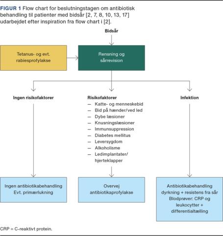Der er international konsensus om, at patienter kan inddeles i lav- og højrisikogruppe afhængigt af sårets natur og ophav samt placering på kroppen og patientkarakteristika [8]. Alligevel er spørgsmålet om, hvornår man bør give antibiotikaprofylakse kontroversielt, da der er meget få data [2, 7, 8, 15]. I en metaanalyse fra 2001 fandt forfatterne, at antibiotikaprofylakse kun medførte reduktion i infektionsrate ved bid fra mennesker og ved bid på hænder [15], og i et systematisk review fra 2019 fandt forfatterne ligeledes ikke evidens for, at antibiotikaprofylakse havde stor effekt ved bidsår, der ikke var på hånden [16]. På trods af svag evidens anbefales af de fleste eksperter og i de fleste studier antibiotikaprofylakse i 3-5 dage ved punktsår, sår ved led, sår fra bid af kat eller menneske, og sår hos patienter med komorbiditeter, der giver øget risiko for infektion [2, 7, 8, 11, 13]. Antibiotikaprofylakse ved sår i ansigtet forbliver kontroversielt, og nogle steder anbefales det, mens det andre steder ikke anbefales pga. ansigtets rige blodforsyning [2, 7, 8, 11, 13]. På baggrund af nuværende danske rekommandationer anbefaler vi ikke antibiotikaprofylakse ved bidsår i ansigtet [17-19]. Ved tegn på infektion i såret bør der altid gives antibiotika [2]. Figur 1 viser et flow chart for beslutningstagen om antibiotikabehandling.