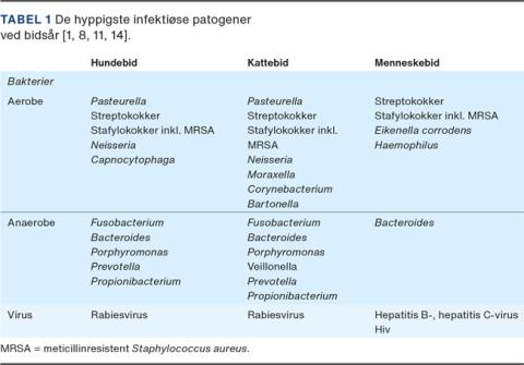 Også patogene vira kan overføres ved bid, og ved menneskebid skal man være særlig opmærksom på risikoen for bl.a. hepatitis B og C samt hiv [11]. I Tabel 1 vises de hyppigste infektiøse patogener ved hunde-, katte- og menneskebid [1, 8, 11, 14].