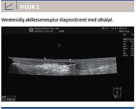 På højre side var der kraftig ømhed og tenformet fortykkelse af akillessenen 2-5 cm over calcaneusfæstet. Her var Thompsons test negativ, og der var bevaret plantarfleksion, men med nedsat kraft. Patienten blev ultralydskannet, og diagnosen lød på total venstresidig akillesseneruptur og højresidig akillessenetendinitis med partiel ruptur (Figur 1).