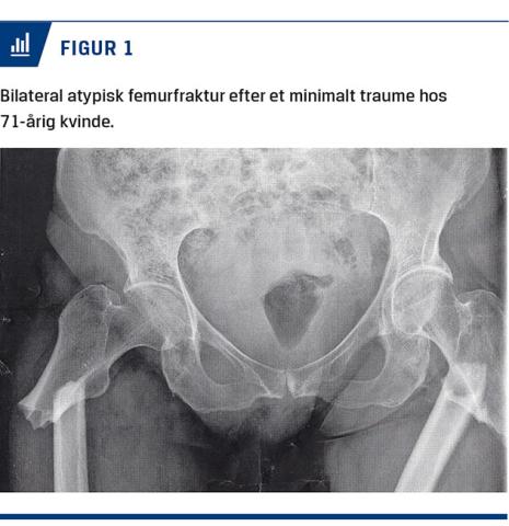 ti år var blevet behandlet med antiresorptiv medicin i form af BP peroralt og denosumab i det seneste halvandet år. Fra tre måneder før indlæggelsen havde hun bemærket smerter lateralt på højre lår, hvilket hun havde tolket som en fibersprængning og derfor ikke havde foretaget sig yderligere. I forbindelse med påklædning stod hun på et ben og bemærkede smerte og knæk i venstre lårben. Umiddelbart efter trådte hun over et dørtrin og faldt. En røntgenundersøgelse afslørede bilateral AFF (Figur 1).