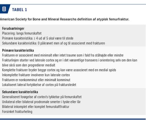 En halv million danskere har osteoporose, og ca. 20% af disse er i behandling. Osteoporotiske hoftefrakturer og rygsammenfald medfører smerter, nedsat funktionsniveau og øget risiko for død. Behandling med bisfosfonat (BP) reducerer risikoen for hoftefraktur og andre frakturer med 50% eller mere. I 2011 udsendte Lægemiddelstyrelsen en advarsel omkring brugen af BP og risiko for atypisk femurfraktur (AFF). Bekymringen for AFF har halveret brugen af BP både i USA og Europa. Risikoen for AFF er lille, men incidensen er fortsat uafklaret. Prævalensen er i flere undersøgelser fundet at være forskellig, men stigende ved langtidsbehandling med BP [1].