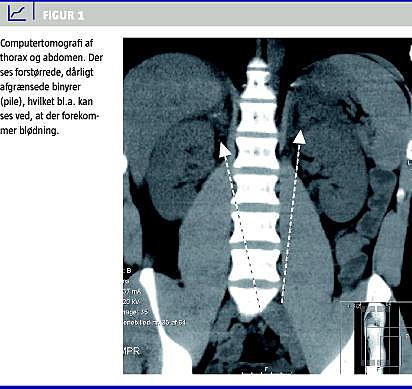 Grundet dårligt blodtryksrespons på væsketerapi og faldende bevidsthedsniveau blev patienten overflyttet til et intensivafsnit, og der blev bl.a. påbegyndt behandling med vasopressorer. Direkte mikroskopi af cerebrospinalvæsken (CSV) viste normale forhold. En computertomografi (CT) viste forstørrede og dårligt afgrænsede binyrer som tegn på blødning (Figur 1 ). Der blev ikke foretaget en synactentest i det akutte forløb, men pga. behandlingsrefraktær hypotension og for at sikre adækvat mineralokortikoideffekt blev der tilføjet indgift af hydrokortison (HK).
