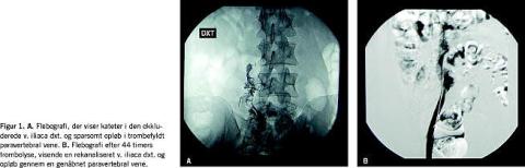 Der blev indledt katetervejledt lokal trombolyse med bilateral anlæggelse af sidehulskatetre i tromberne via vv. poplitea og infusion af lavdosis alteplase med 0,6 mg pr. time i hvert ben og dosisjusteret ufraktioneret heparin på ca. 1.500 IE pr. time. Afsluttende flebografikontrol efter 44 timers trombolyse viste næsten total tromberegression bilateralt med enkelte mindre randstillede tromber i venstre v. iliaca samt spontant afløb i de rekanaliserede paravertebrale vener (Figur 1B). Patienten blev udskrevet i velbefindende efter seks dage, han skulle fortsat behandles med høje graduerede kompressionsstrømper, selvadministreret tinzaparin i 14 dage og peroral antikoagulans (AK). Ved kontrol efter et år var patienten symptomfri og havde åbent og sufficient dybt venesystem i begge underekstremiteter, hvilket blev visualiseret ved en ultralydduplexskanning. Ved fortsat AK-behandling forventes det, at patienten kan fortsætte med at være symptomfri og undgå posttrombotisk syndrom (PTS), da der foreløbig er konstateret normal veneklapsfunktion i begge ben.