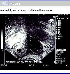 En 33-årig kvinde blev henvist til Gynækologisk Afdeling med nedre abdominalsmerter. Tidligere gynækologisk rask, en provokeret abort for otte år siden, en normal fødsel for tre år siden. Nu spontant gravid med menostasi svarende til uge 6+4. Hun havde gennem nogle dage haft intermitterende venstresidige nedre abdominalsmerter, som nu var tiltaget, og der var forværring ved bevægelse. Der var sparsom vaginalblødning. Objektivt var patienten upåvirket, ved gynækologisk undersøgelse fandtes ømhed og peritonealreaktion over venstre adnex. Ved vaginal ultralydskanning fandtes en venstresidig ekstrauterin gestationssæk med en blommesæk (Figur 1 ) og desuden en moderat mængde fri væske i abdomen. Højre adnex var upåfaldende, og uterus var tom med normalt endometrium.